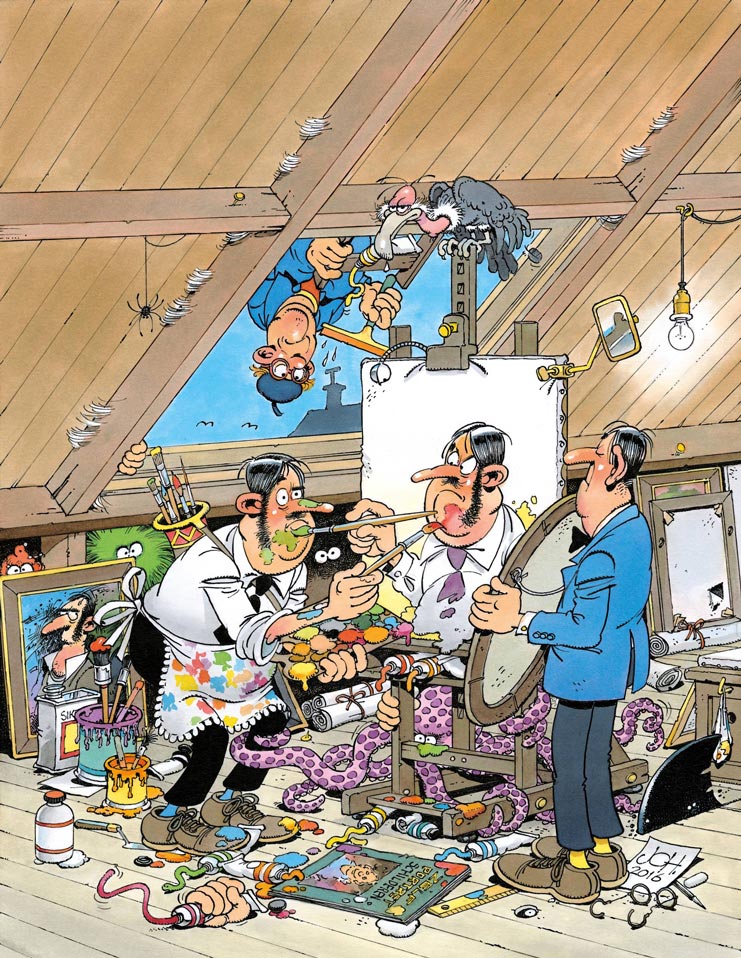 Er speelde ook nog iets anders. Van Die: ,,We raakten eind jaren 80 een beetje vervreemd van ons eigen werk. We moesten in die periode zoveel Sjors en Sjimmie’s maken dat het meer en meer ‘studiowerk’ werd: een groot deel van de strips werd uitbesteed aan collega’s in Spanje. En die collega’s in Spanje, eh, tja…’’ Van der Kroft: ,,Er zat één goede bij, hoor. Die was tot een redelijke Sjimmie in staat.’’